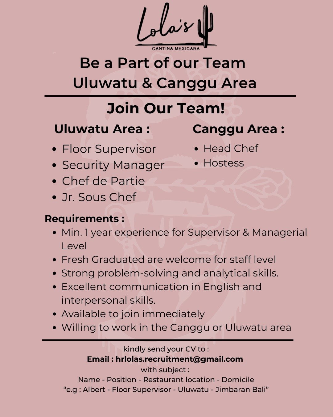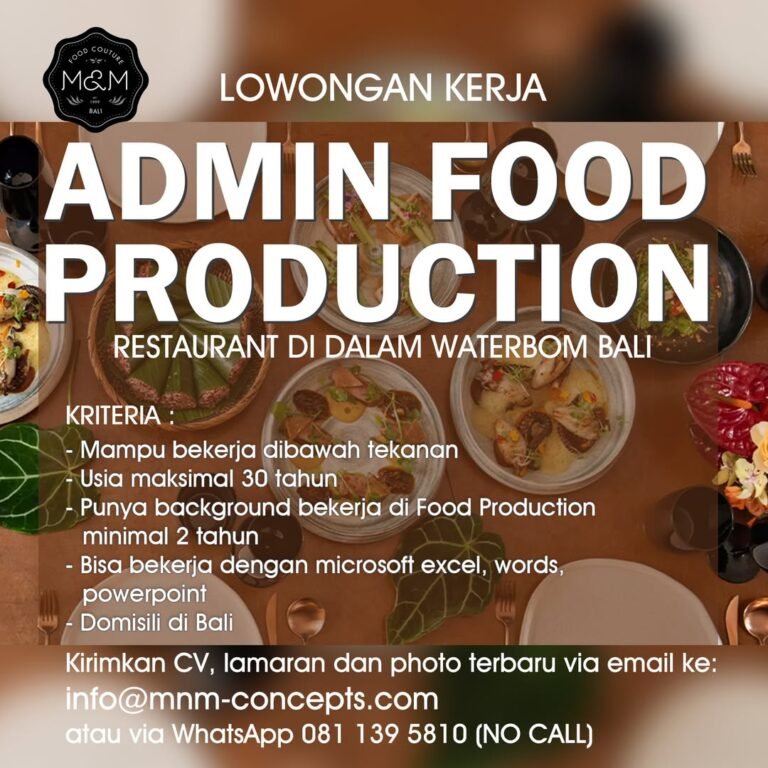 Sementara itu, posisi Admin Food Production ditujukan bagi pelamar dengan pengalaman minimal dua tahun di bidang food production. Kandidat diharapkan terbiasa bekerja dengan Microsoft Excel, Word, dan PowerPoint, memiliki kedisiplinan kerja yang baik, serta siap bekerja dalam ritme operasional restoran. Benefit yang ditawarkan meliputi gaji sesuai UMK Badung, BPJS Kesehatan dan Ketenagakerjaan, serta service charge setelah masa probation tiga bulan. Lamaran dapat dikirim melalui email ke info@mnm-concepts.com atau WhatsApp 0811-3958-10 (no call).