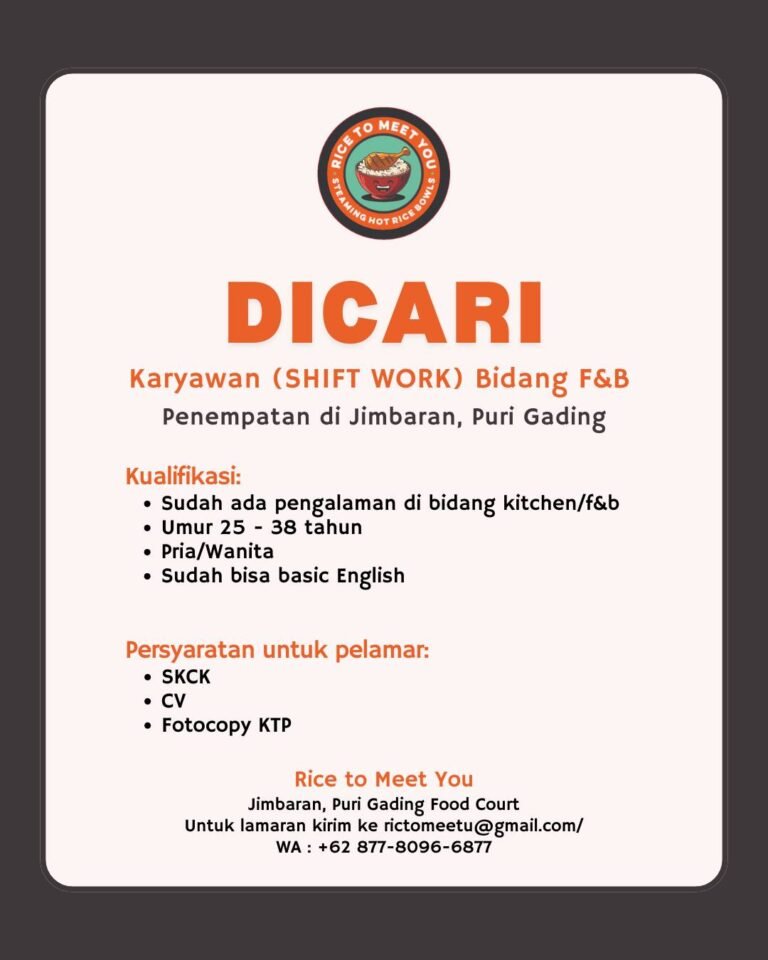 LOKER.BALINEWS.ID, BADUNG – Industri kuliner di kawasan Jimbaran kembali menggeliat dengan dibukanya kesempatan berkarir di Rice to Meet You. Unit usaha yang bergerak di bidang food & beverages ini sedang mencari individu berbakat untuk mengisi posisi Karyawan (Shift Work) guna memperkuat tim operasional mereka. Penempatan kerja akan dipusatkan di lokasi strategis, yaitu Puri Gading Food Court, Jimbaran, Kabupaten Badung.