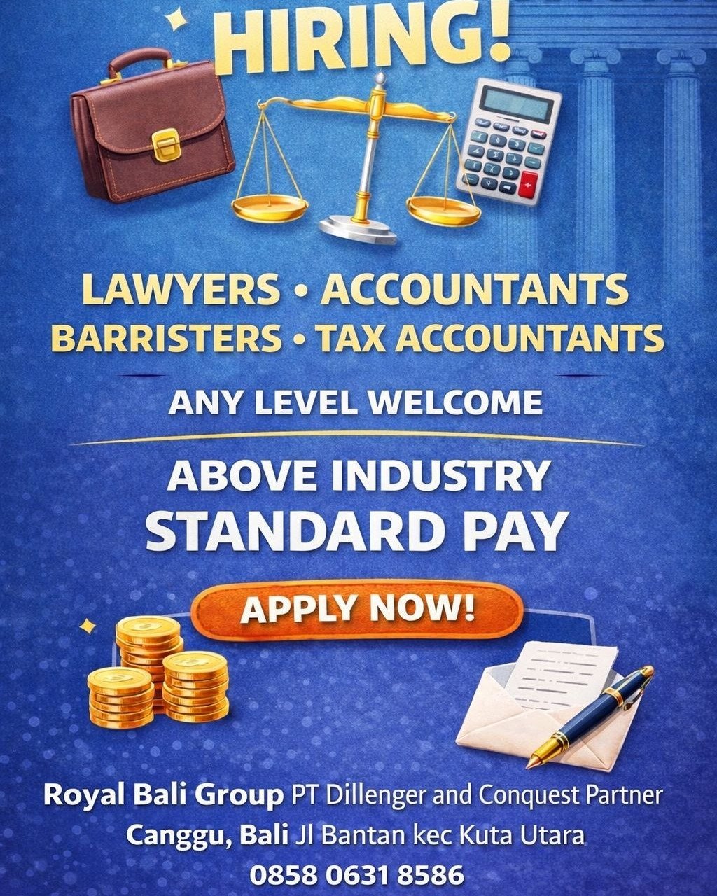 LOKER.BALINEWS.ID, BADUNG – Kabar gembira bagi para profesional di bidang hukum dan keuangan yang ingin meniti karier di kawasan prestisius Canggu. Royal Bali Group (PT Dillenger and Conquest Partner) saat ini sedang membuka kesempatan karier besar-besaran untuk mengisi beberapa posisi strategis. Perusahaan yang beralamat di Jalan Bantan, Kecamatan Kuta Utara ini mencari kandidat untuk posisi Lawyer, Accountants, Barristers, hingga Tax Accountants.
