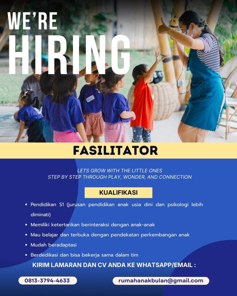 LOKER.BALINEWS.ID, BALI – Dunia pendidikan anak usia dini di Bali kembali memberikan kesempatan bagi para pengajar yang berdedikasi. Rumah Anak Bulan saat ini membuka lowongan kerja untuk posisi Fasilitator. Dengan mengusung semangat untuk tumbuh bersama anak-anak melalui pendekatan bermain dan koneksi yang bermakna, lembaga ini mencari individu yang siap memberikan dampak positif bagi perkembangan generasi mendatang di Pulau Dewata.