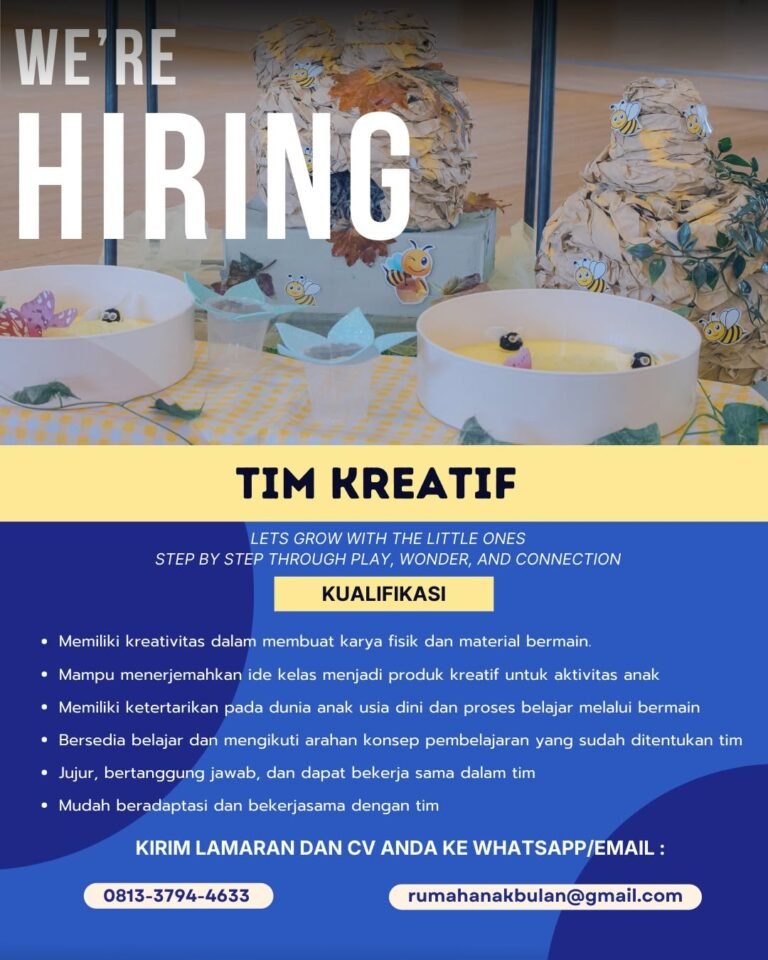 LOKER.BALINEWS.ID, BALI – Rumah Anak Bulan kembali membuka kesempatan bagi para kreator di Bali untuk bergabung sebagai bagian dari Tim Kreatif. Lembaga pendidikan ini berfokus pada pengembangan anak usia dini melalui metode bermain yang bermakna, sehingga membutuhkan individu yang mampu menghadirkan inovasi dalam setiap media pembelajaran. Posisi ini sangat cocok bagi Anda yang ingin mengolaborasikan sisi artistik dengan dunia pendidikan anak-anak yang penuh kegembiraan.