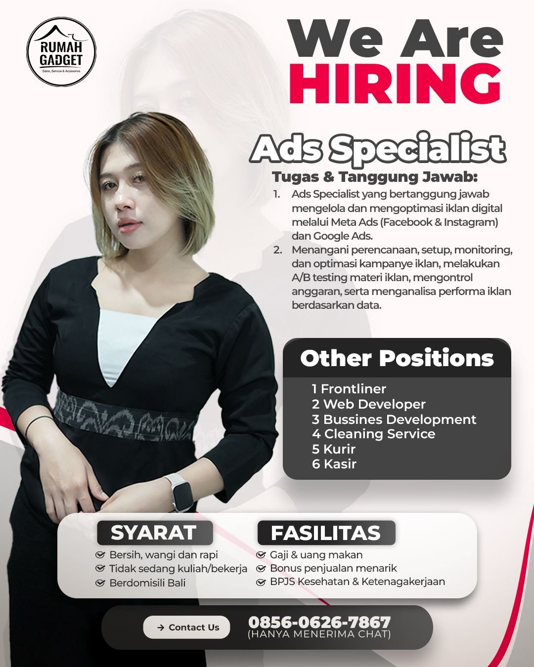 Selain posisi tersebut, Rumah Gadget juga membuka peluang kerja untuk beberapa posisi operasional lainnya, antara lain Frontliner, Web Developer, Business Development, Cleaning Service, Kurir, dan Kasir. Perusahaan menetapkan persyaratan umum bagi pelamar yakni berpenampilan bersih, rapi, tidak sedang menempuh pendidikan atau bekerja di tempat lain, serta berdomisili di Bali. Sebagai bentuk apresiasi, karyawan akan mendapatkan berbagai fasilitas seperti gaji, uang makan, bonus penjualan yang menarik, serta jaminan perlindungan BPJS Kesehatan dan Ketenagakerjaan. Bagi Anda yang berminat, silakan hubungi kontak resmi melalui WhatsApp di nomor 0856-0626-7867 (hanya menerima pesan teks).