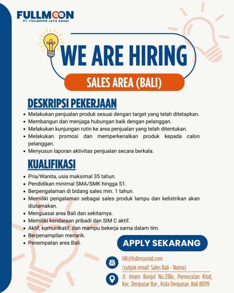 LOKER.BALINEWS.ID, DENPASAR — PT Fullmoon Jaya Abadi membuka Lowongan Kerja Bali Sales Area di Fullmoon untuk memperkuat tim penjualan yang bertugas mengembangkan pasar di wilayah Bali. Posisi ini menuntut kemampuan komunikasi yang baik, mobilitas tinggi, serta komitmen mencapai target penjualan.