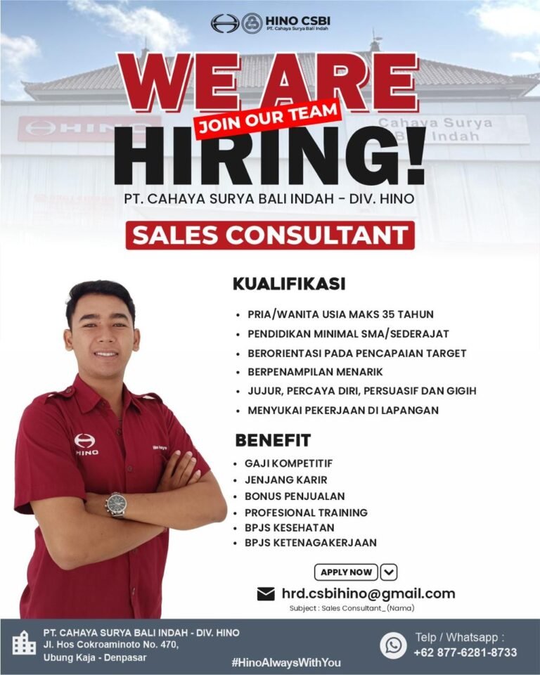 LOKER.BALINEWS.ID, DENPASAR – PT Cahaya Surya Bali Indah (Divisi Hino) yang berlokasi di Ubung Kaja, Denpasar, sedang mencari individu yang dinamis dan kompetitif untuk bergabung sebagai Sales Consultant. Posisi ini terbuka bagi mereka yang menyukai tantangan pekerjaan lapangan dan memiliki orientasi kuat terhadap pencapaian target penjualan. Perusahaan menawarkan berbagai keuntungan menarik termasuk gaji kompetitif, bonus penjualan, serta fasilitas BPJS Kesehatan dan Ketenagakerjaan bagi kandidat yang terpilih.