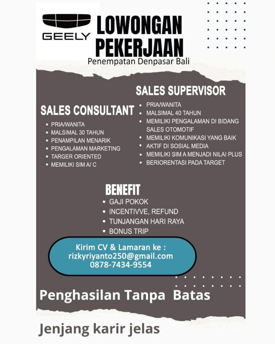 LOKER.BALINEWS.ID, DENPASAR – Dealer Geely yang berlokasi di Denpasar, Bali saat ini membuka lowongan kerja Bali untuk posisi Sales Consultant dan Sales Supervisor. Kesempatan ini terbuka bagi pria maupun wanita yang memiliki minat dan pengalaman di bidang penjualan, khususnya industri otomotif.
