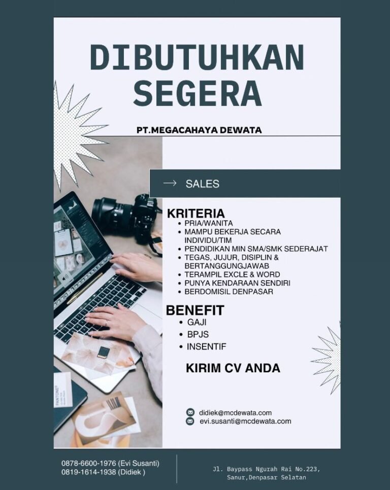 LOKER.BALINEWS.ID, DENPASAR – PT. Megacahaya Dewata, sebuah perusahaan yang berlokasi di Sanur, Denpasar Selatan, saat ini sedang membuka peluang karier bagi para profesional muda di Bali. Perusahaan sedang membutuhkan tenaga kerja baru untuk mengisi posisi Sales yang akan berperan dalam mendukung pertumbuhan bisnis perusahaan. Lowongan ini terbuka bagi pria maupun wanita yang memiliki integritas tinggi dan mampu bekerja secara mandiri maupun di dalam tim.