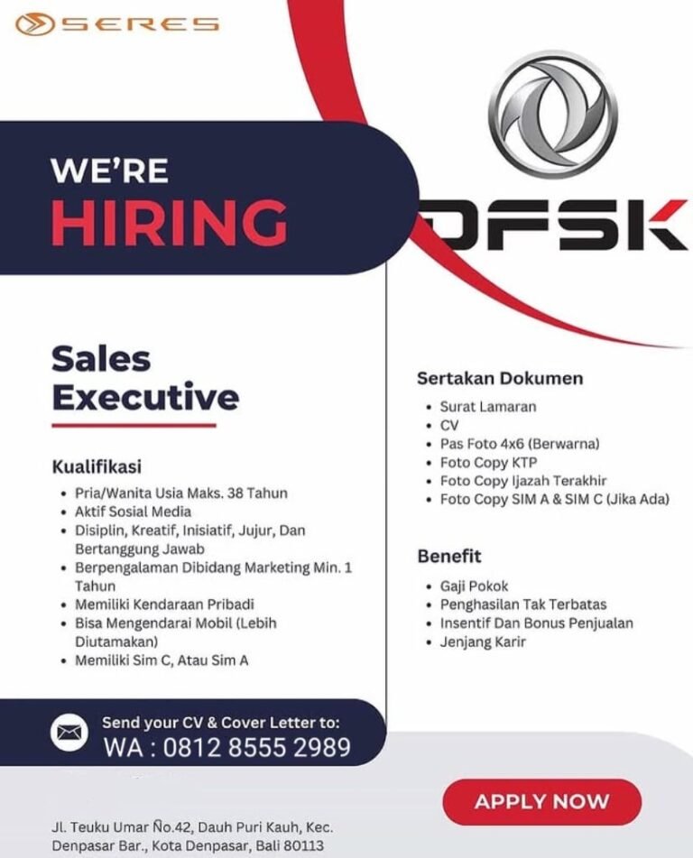 Loker.BaliNews.id, Denpasar – DFSK (SERES) melalui PT Bevos Auto Mandiri membuka peluang karier bagi kandidat yang energik dan berorientasi pada penjualan untuk bergabung sebagai Sales Executive. Posisi ini terbuka bagi pria maupun wanita dengan usia maksimal 38 tahun, aktif di media sosial, serta memiliki sikap disiplin, kreatif, inisiatif, jujur, dan bertanggung jawab.