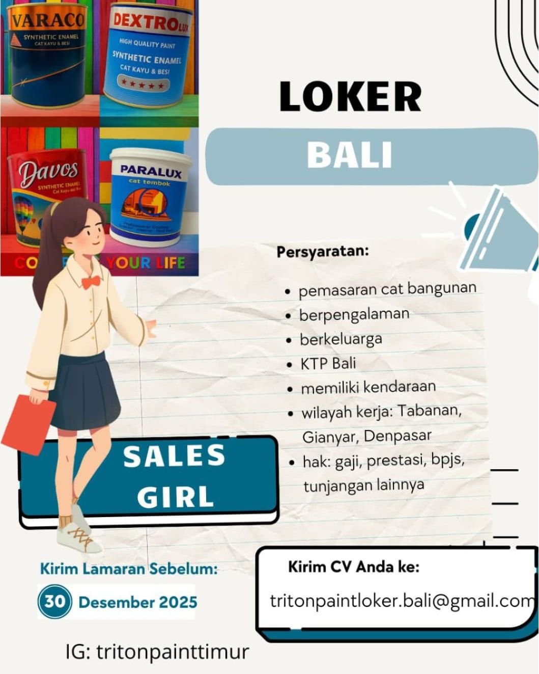 Kirimkan lamaran sebelum 30 Desember 2025 ke email: tritonpaintloker.bali@gmail.com