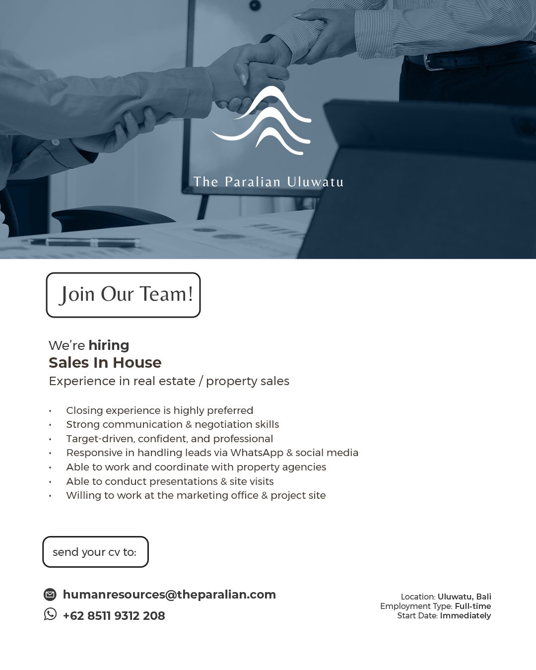 LOKER.BALINEWS.ID, BADUNG – The Paralian Uluwatu, sebuah perusahaan yang bergerak di sektor real estat dan properti, saat ini sedang membuka kesempatan berkarir bagi para profesional untuk bergabung dalam tim mereka. Perusahaan mencari kandidat untuk dua posisi strategis, yaitu Sales In House dan Finance Forecasting, guna mendukung ekspansi proyek properti di kawasan Uluwatu yang terus berkembang pesat. Para staf yang terpilih nantinya akan bekerja secara purna waktu (full-time) dan diharapkan dapat segera bergabung untuk memperkuat operasional perusahaan.