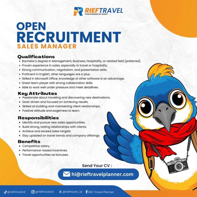 LOKER.BALINEWS.ID, BALI – Rief Travel membuka lowongan kerja Bali terbaru untuk posisi Sales Manager. Dibutuhkan kandidat berpengalaman di bidang penjualan, khususnya travel atau hospitality, memiliki kemampuan komunikasi, negosiasi, dan presentasi yang baik, serta fasih berbahasa Inggris. Kandidat diharapkan mampu membangun relasi klien, mencapai target penjualan, dan mengikuti tren industri perjalanan. Perusahaan menawarkan gaji kompetitif, insentif berbasis kinerja, serta kesempatan bonus perjalanan.