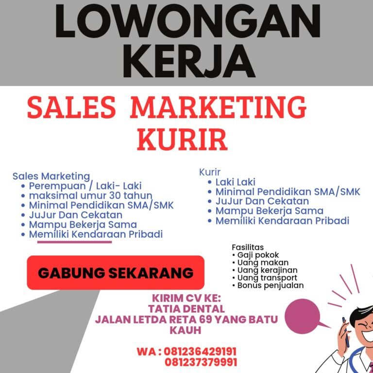 Sementara itu, posisi Kurir dibuka untuk pelamar laki-laki lulusan minimal SMA/SMK yang siap bekerja di lapangan. Tatia Dental menawarkan berbagai fasilitas menarik seperti gaji pokok, uang makan, uang transport, uang kerajinan, serta bonus penjualan. Pelamar dapat mengirimkan lamaran langsung ke alamat yang tertera atau menghubungi nomor WhatsApp untuk informasi lebih lanjut mengenai proses rekrutmen.