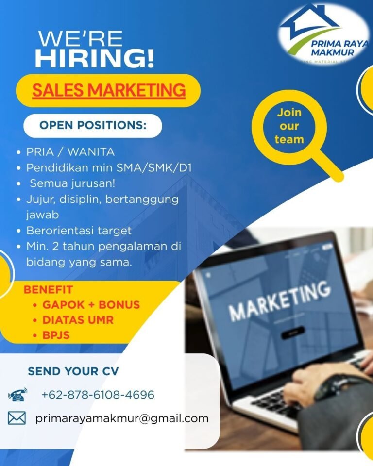 Bagi Anda yang berminat melamar lowongan kerja Bali posisi Sales Marketing di Prima Raya Makmur, silakan mengirimkan CV dan surat lamaran melalui WhatsApp +62 878 6108 4696 atau email primarayamakmur@gmail.com.