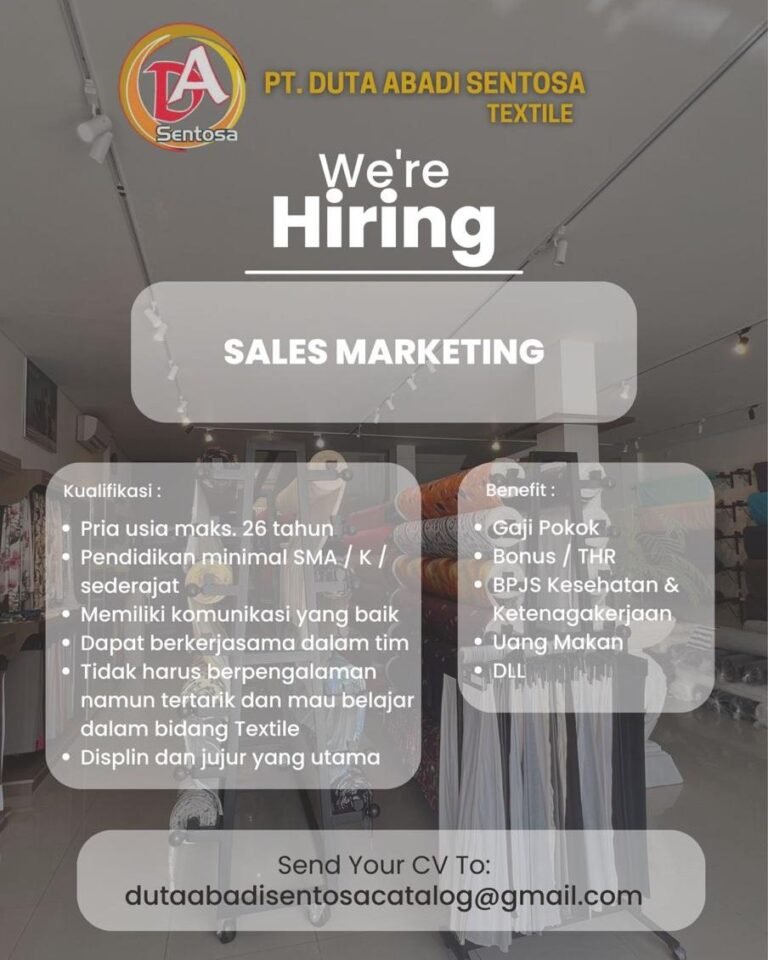 LOKER.BALINEWS.ID, DENPASAR — PT Duta Abadi Sentosa Textile membuka lowongan kerja untuk posisi Sales Marketing bagi kandidat yang siap berkembang di industri tekstil. Perusahaan mencari pelamar pria dengan usia maksimal 26 tahun, lulusan minimal SMA/SMK atau sederajat, serta memiliki kemampuan komunikasi yang baik. Kandidat diharapkan disiplin, jujur, mampu bekerja sama dalam tim, dan memiliki minat belajar meskipun belum memiliki pengalaman di bidang penjualan tekstil.