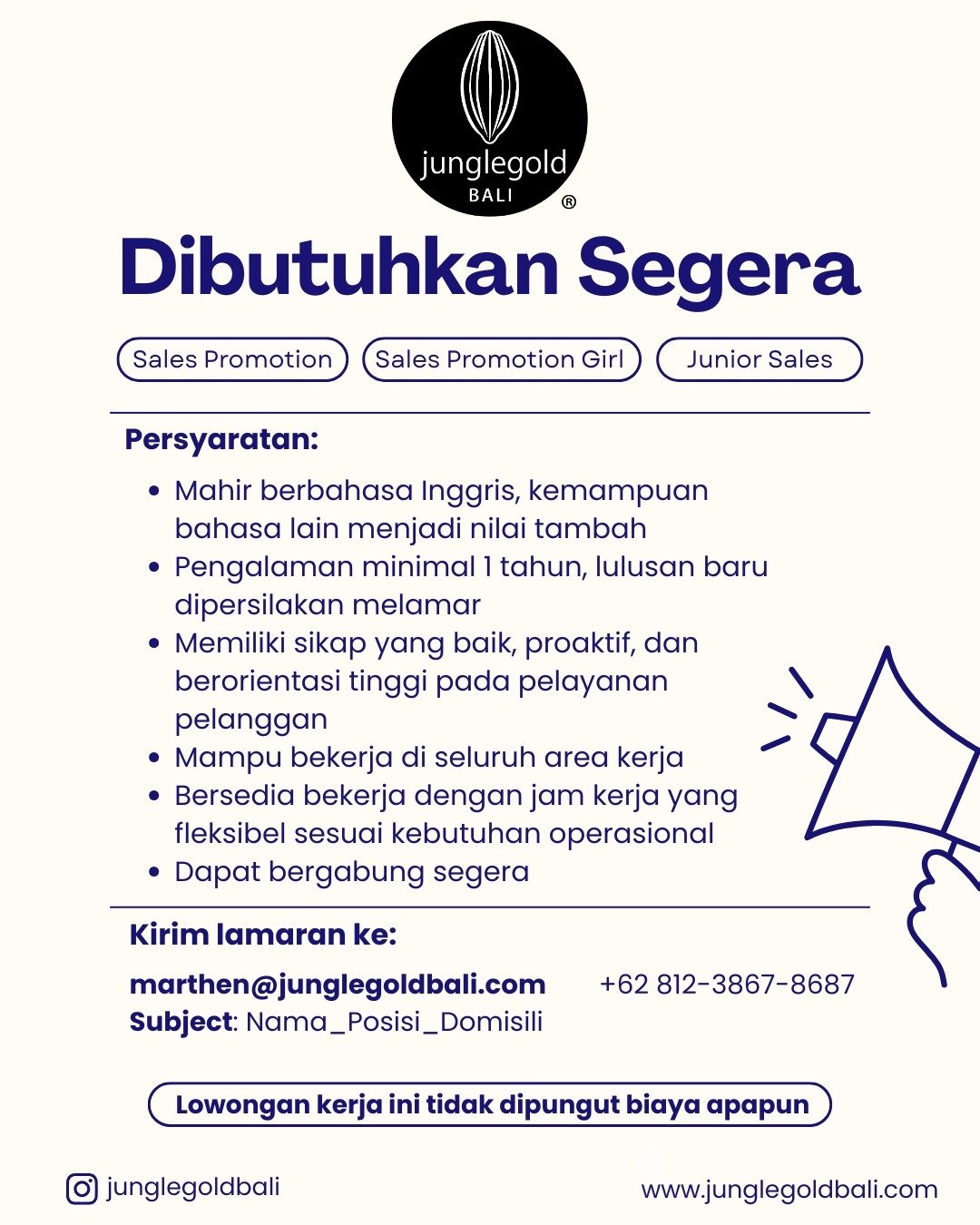 LOKER.BALINEWS.ID, BADUNG — Jungle Gold Bali membuka lowongan untuk posisi Sales Promotion, Sales Promotion Girl, dan Junior Sales.