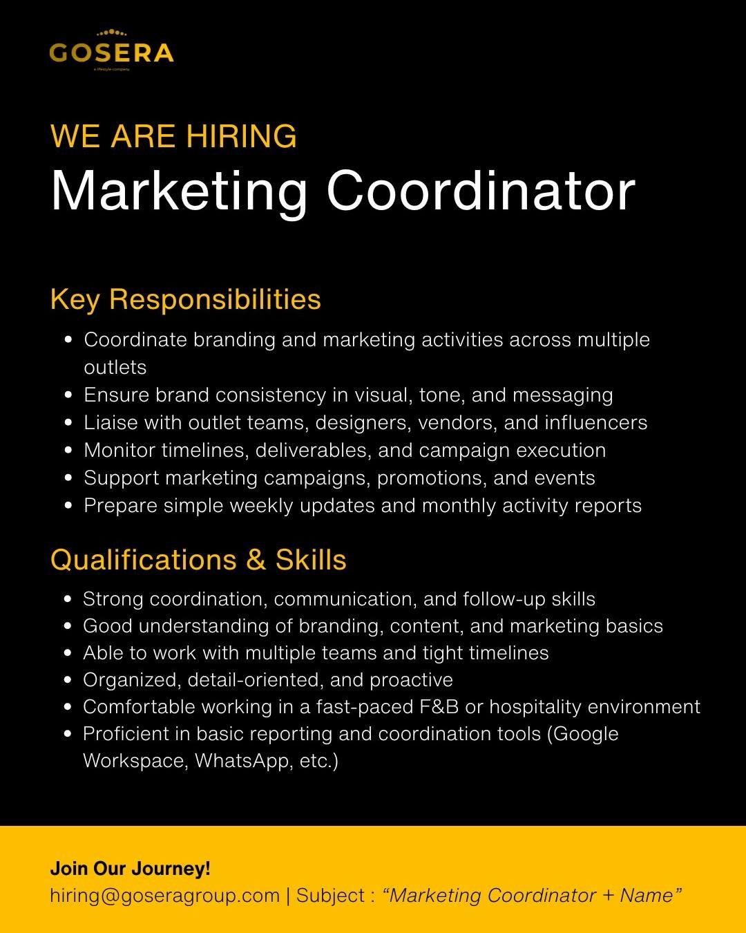 Persyaratan: mahir berbahasa Inggris (bahasa tambahan menjadi nilai plus), pengalaman minimal 1 tahun — namun lulusan baru dipersilakan melamar, berkepribadian baik, proaktif, berorientasi pada pelayanan, siap bekerja di seluruh area kerja, fleksibel dengan jam kerja, dan dapat bergabung segera.