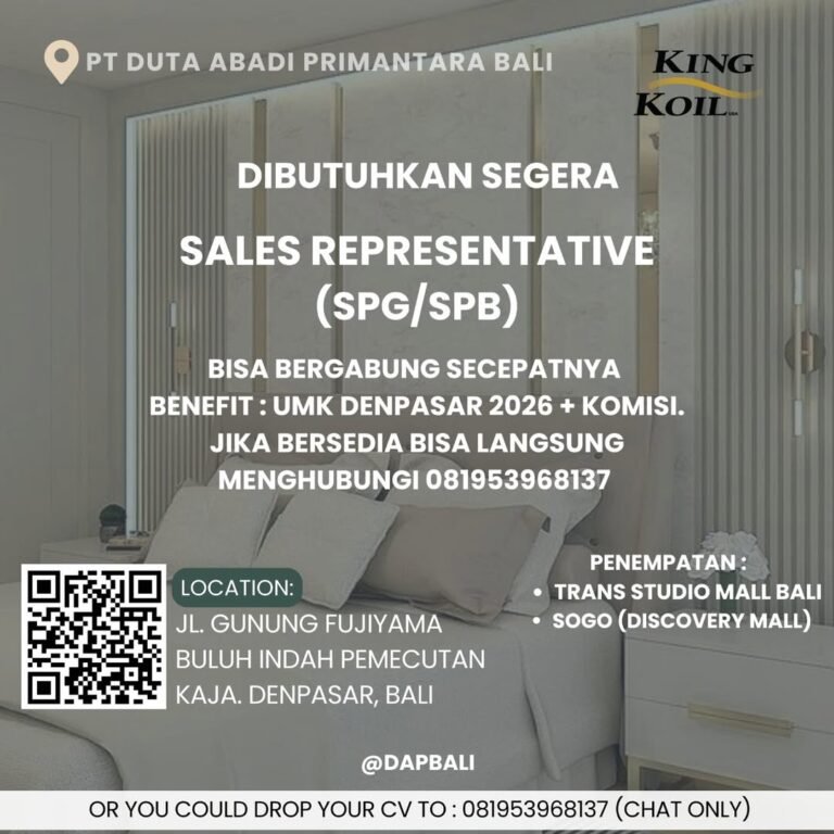 LOKER.BALINEWS.ID, DENPASAR — Peluang karir di bidang penjualan produk premium kini dibuka oleh PT Duta Abadi Primantara Bali, pemegang lisensi merek kasur ternama King Koil. Perusahaan sedang mencari kandidat potensial untuk mengisi posisi Sales Representative (SPG/SPB) yang siap bergabung secepatnya. Penempatan kerja akan difokuskan pada dua lokasi strategis di Bali, yaitu Trans Studio Mall Bali dan SOGO Discovery Mall.