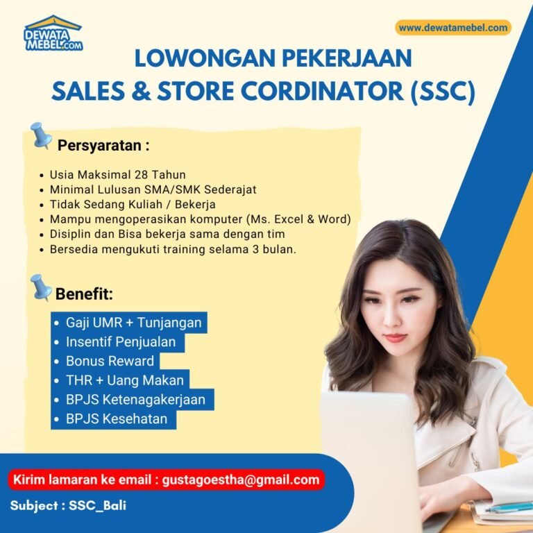 LOKER.BALINEWS.ID, BALI — Dewata Mebel, salah satu penyedia furnitur terkemuka, saat ini sedang membuka kesempatan berkarir bagi tenaga profesional muda untuk posisi Sales & Store Coordinator (SSC). Perusahaan mencari kandidat yang disiplin dan memiliki kemampuan koordinasi yang baik untuk memastikan operasional toko dan target penjualan berjalan secara optimal.