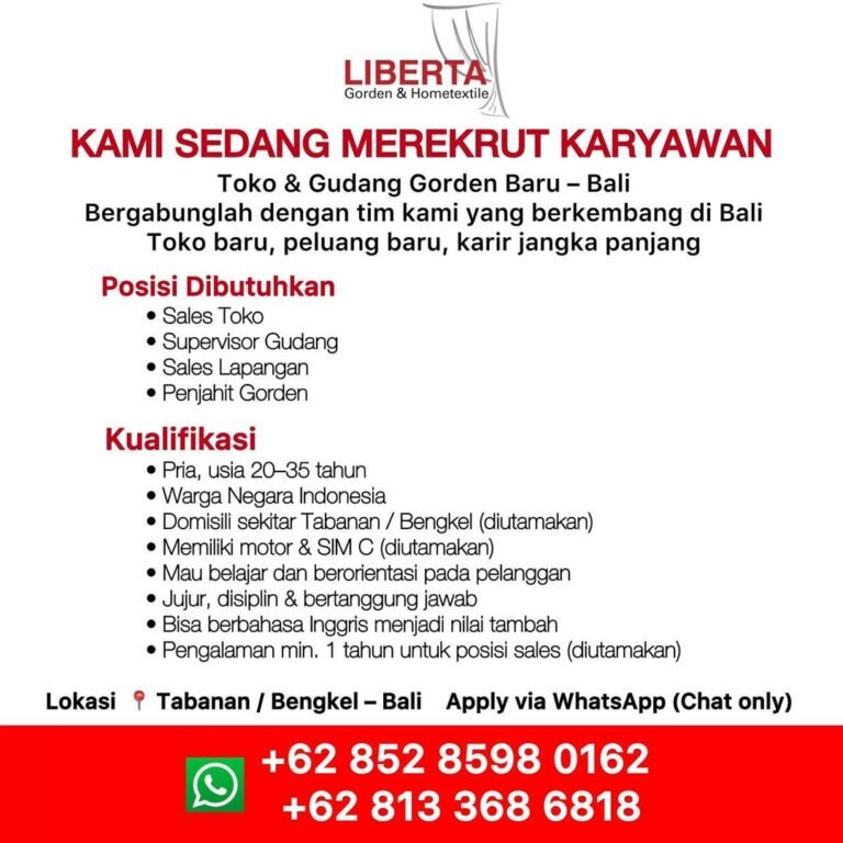 LOKER.BALINEWS.ID, TABANAN – Liberta Gorden & Hometextile, sebuah unit bisnis yang bergerak di bidang perlengkapan rumah tangga, saat ini tengah melakukan ekspansi dengan membuka toko dan gudang baru di wilayah Bali. Dalam rangka pengembangan tim tersebut, perusahaan membuka kesempatan karier jangka panjang untuk beberapa posisi sekaligus, yakni Sales Toko, Supervisor Gudang, Sales Lapangan, dan Penjahit Gorden. Lowongan ini merupakan peluang bagi masyarakat lokal untuk bergabung dengan tim yang sedang berkembang dinamis di industri hometextile.
