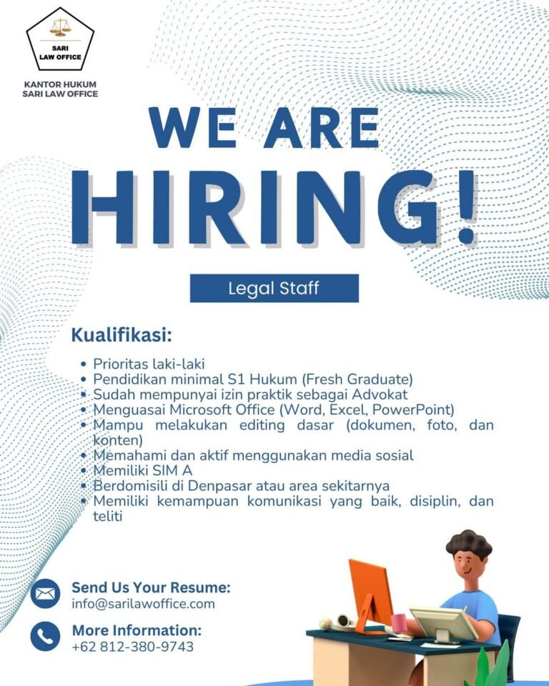 LOKER.BALINEWS.ID, DENPASAR – Sari Law Office membuka kesempatan bagi lulusan S1 Hukum untuk bergabung sebagai Legal Staff. Posisi ini diprioritaskan untuk kandidat laki-laki yang sudah memiliki izin praktik sebagai advokat, mampu mengoperasikan Microsoft Office, serta memahami proses editing dasar dokumen, foto, dan konten. Kantor hukum ini juga mencari pelamar yang aktif menggunakan media sosial dan memiliki SIM A.