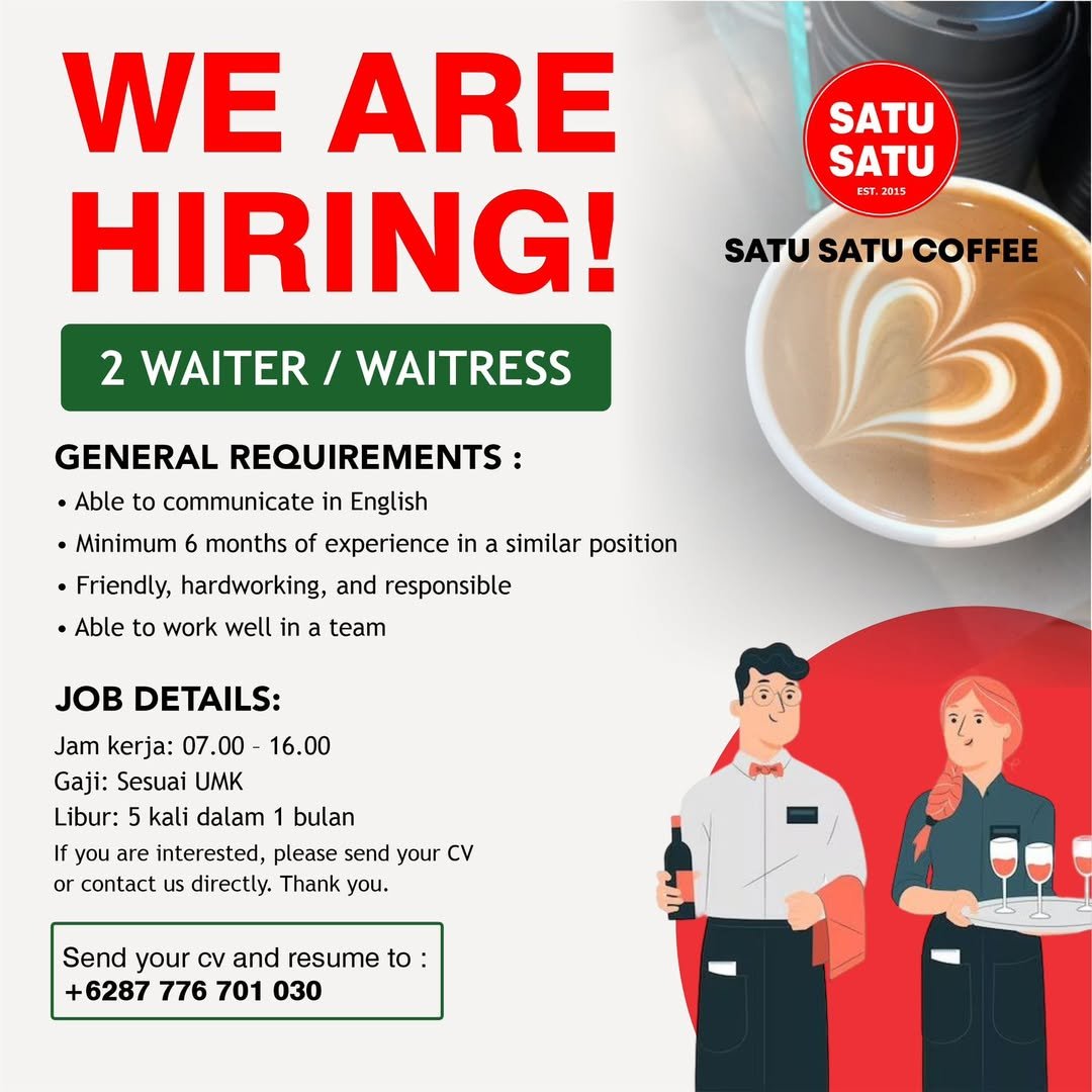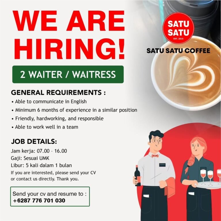 LOKER.BALINEWS.ID, BADUNG – Satu Satu Coffee, sebuah destinasi kuliner populer yang berlokasi di kawasan Canggu, saat ini sedang membuka kesempatan berkarir bagi individu yang dinamis dan bersemangat untuk mengisi posisi sebagai Waiter atau Waitress. Cafe ini mencari dua orang tenaga kerja yang memiliki kemampuan berkomunikasi dalam bahasa Inggris serta memiliki pengalaman minimal 6 bulan di posisi serupa. Kandidat yang diharapkan adalah sosok yang ramah, pekerja keras, bertanggung jawab, dan mampu bekerja secara efektif dalam tim.
