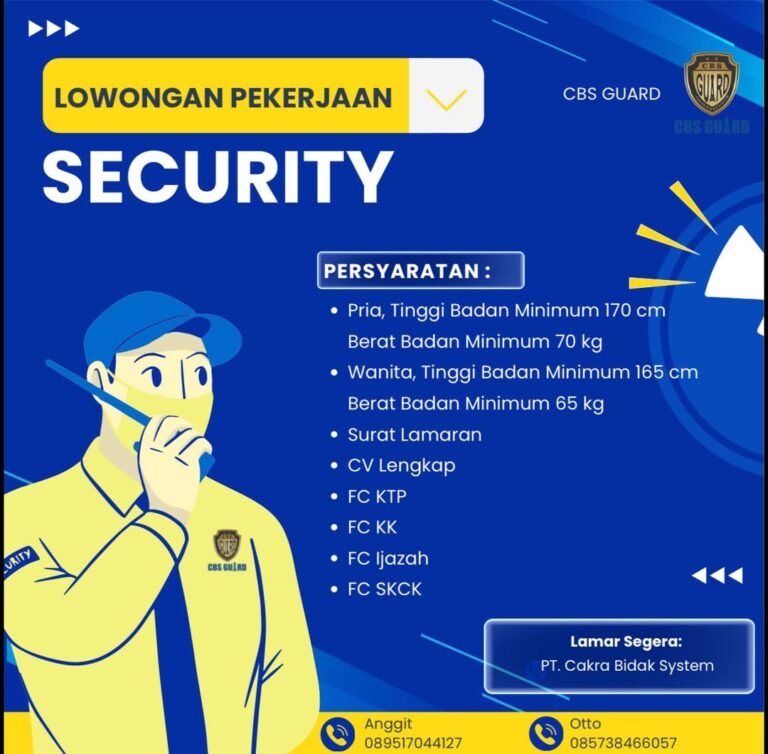 Bagi Anda yang berminat melamar lowongan kerja Bali posisi Security di CBS Guard, silakan segera menghubungi Anggit (0895 1704 4127) atau Otto (0857 3846 6057) untuk proses lamaran dan informasi lebih lanjut.