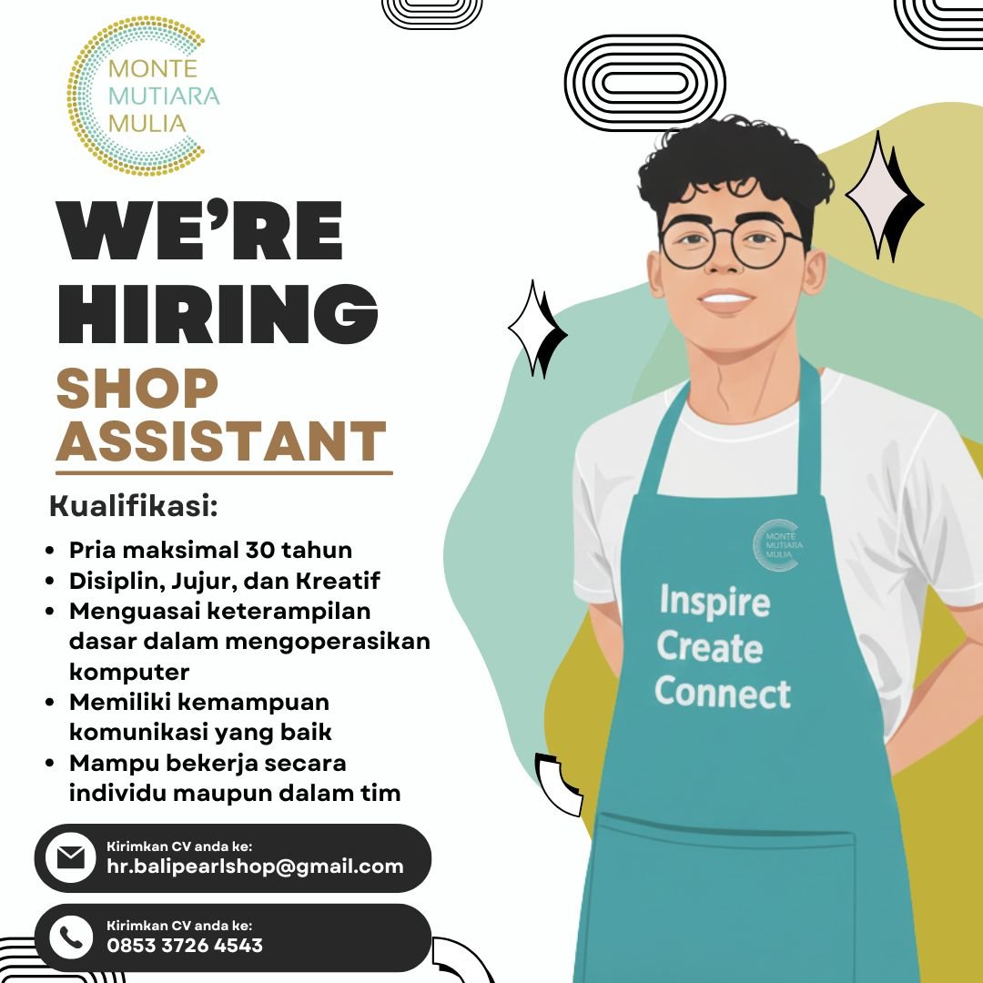 LOKER.BALINEWS.ID, BALI – Perusahaan Monte Mutiara Mulia yang bergerak di sektor retail sedang membuka peluang karier bagi individu kreatif di Pulau Dewata untuk mengisi posisi sebagai Shop Assistant. Rekrutmen ini bertujuan untuk mencari tenaga kerja yang mampu memberikan layanan terbaik kepada pelanggan sekaligus mendukung operasional harian toko dengan semangat “Inspire, Create, Connect”.