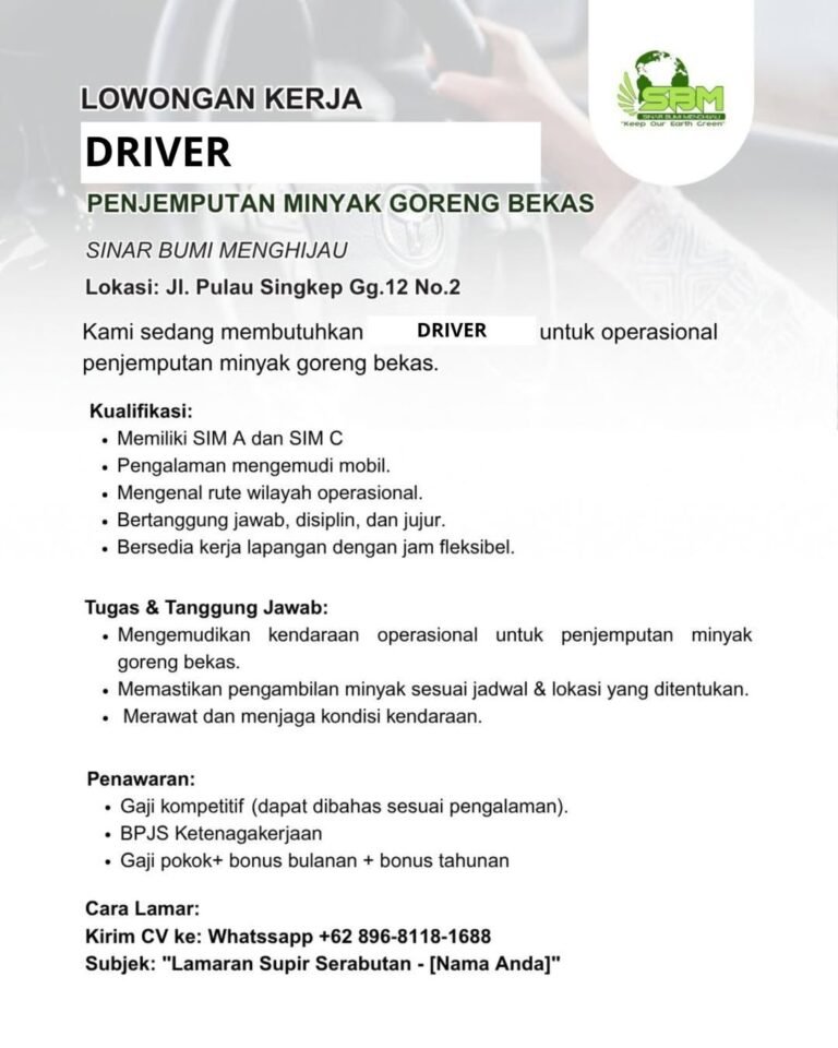Kandidat yang dicari diwajibkan memiliki Surat Izin Mengemudi (SIM) kategori A dan C serta memiliki pengalaman dalam mengemudi mobil. Selain harus mengenal rute wilayah operasional dengan baik, pelamar diharapkan memiliki sikap disiplin, jujur, dan bertanggung jawab dalam merawat kondisi kendaraan operasional. Perusahaan menawarkan paket kompensasi menarik berupa gaji kompetitif, gaji pokok ditambah bonus bulanan dan tahunan, serta jaminan BPJS Ketenagakerjaan. Bagi masyarakat yang berminat, berkas CV dapat dikirimkan melalui WhatsApp ke nomor +62 896-8118-1688 dengan subjek “Lamaran Supir Serabutan – [Nama Anda]”.