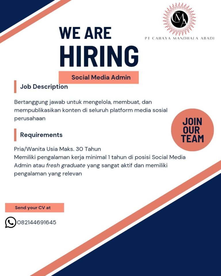 LOKER.BALINEWS.ID, DENPASAR – PT Cahaya Mandhala Abadi, sebuah perusahaan yang bergerak di bidang distribusi kosmetik, saat ini tengah membuka peluang karier bagi tenaga kreatif untuk mengisi posisi Social Media Admin. Perusahaan yang beralamat di Jalan Gatot Subroto I No. 8, Denpasar Utara ini mencari individu yang kompeten dalam mengelola ekosistem digital perusahaan. Posisi ini memegang peranan penting dalam membangun interaksi dengan pelanggan serta memperkuat brand awareness produk di berbagai platform media sosial.
