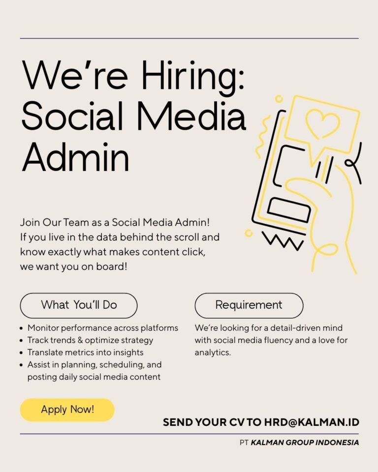 LOKER.BALINEWS.ID, BALI – PT Kalman Group Indonesia saat ini sedang membuka kesempatan karir bagi individu yang kreatif dan analitis untuk mengisi posisi Social Media Admin. Perusahaan mencari kandidat yang memiliki ketertarikan mendalam terhadap data di balik konten media sosial dan memahami strategi yang membuat sebuah konten berhasil menarik perhatian audiens. Kualifikasi utama yang dibutuhkan adalah sosok yang teliti, fasih dalam menggunakan berbagai platform media sosial, serta memiliki kegemaran terhadap dunia analitik.