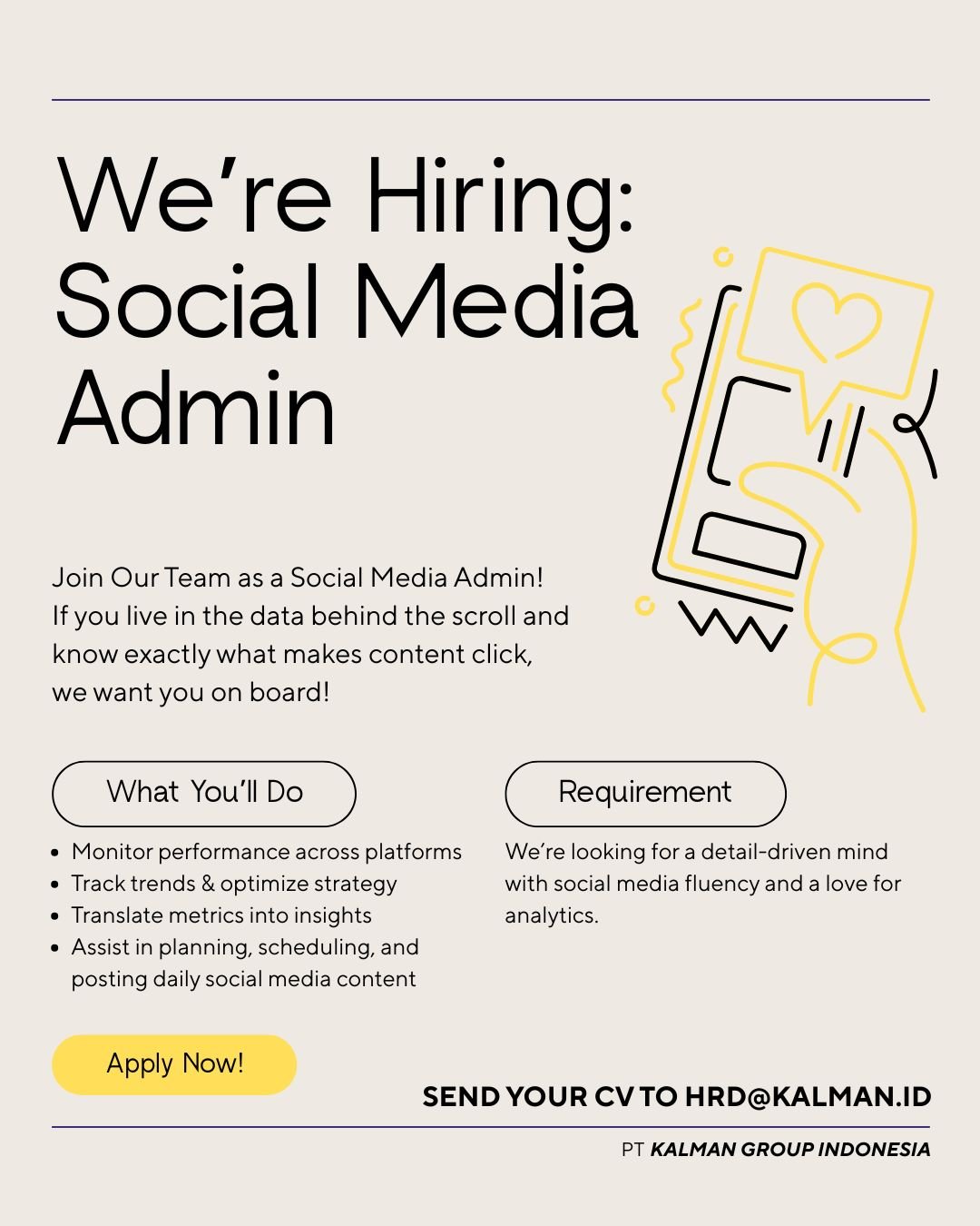 Loker.BaliNews.id, Bali – PT Kalman Group Indonesia membuka kesempatan bagi talenta kreatif dan analitis untuk bergabung sebagai Social Media Admin. Posisi ini ditujukan bagi kandidat yang memahami tren media sosial, mampu membaca data performa konten, serta memiliki ketertarikan tinggi terhadap analitik digital.