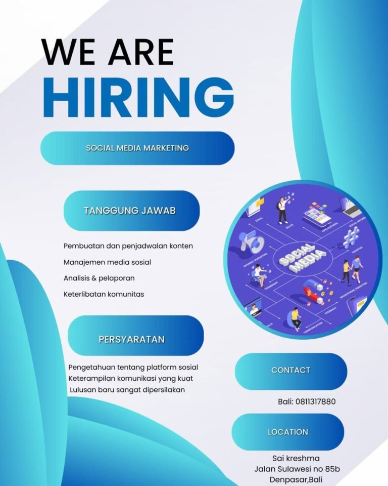 LOKER.BALINEWS.ID, DENPASAR — Sai Kreshma yang berlokasi di Jalan Sulawesi No. 85b, Denpasar, saat ini tengah membuka kesempatan karir bagi individu kreatif untuk mengisi posisi Social Media Marketing. Perusahaan mencari kandidat yang mampu mengelola ekosistem digital mereka, mulai dari pembuatan dan penjadwalan konten, manajemen media sosial, hingga melakukan analisis dan pelaporan performa konten secara berkala.