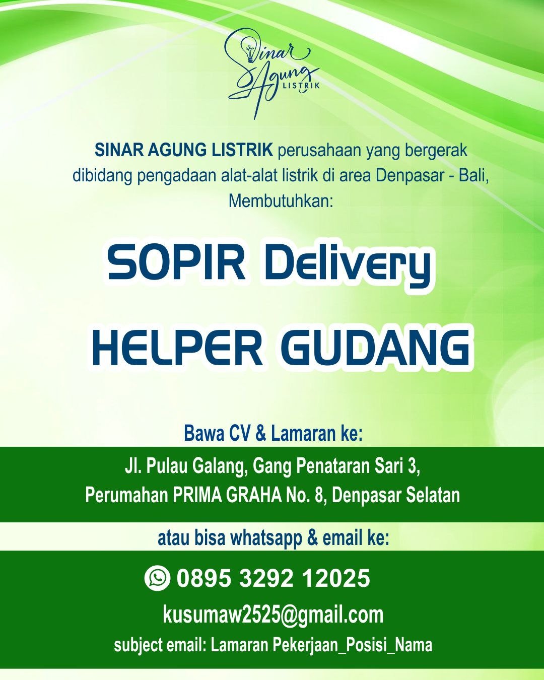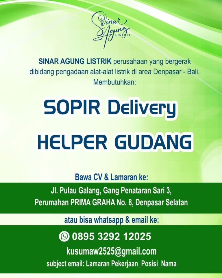 LOKER.BALINEWS.ID, DENPASAR — Sinar Agung Listrik, perusahaan yang bergerak di bidang pengadaan alat-alat listrik, membuka kesempatan kerja untuk posisi Sopir Delivery dan Helper Gudang. Kandidat diharapkan memiliki tanggung jawab tinggi, siap bekerja dalam tim, serta bersedia mengirimkan lamaran langsung atau melalui WhatsApp/email sesuai informasi pada pengumuman lowongan.