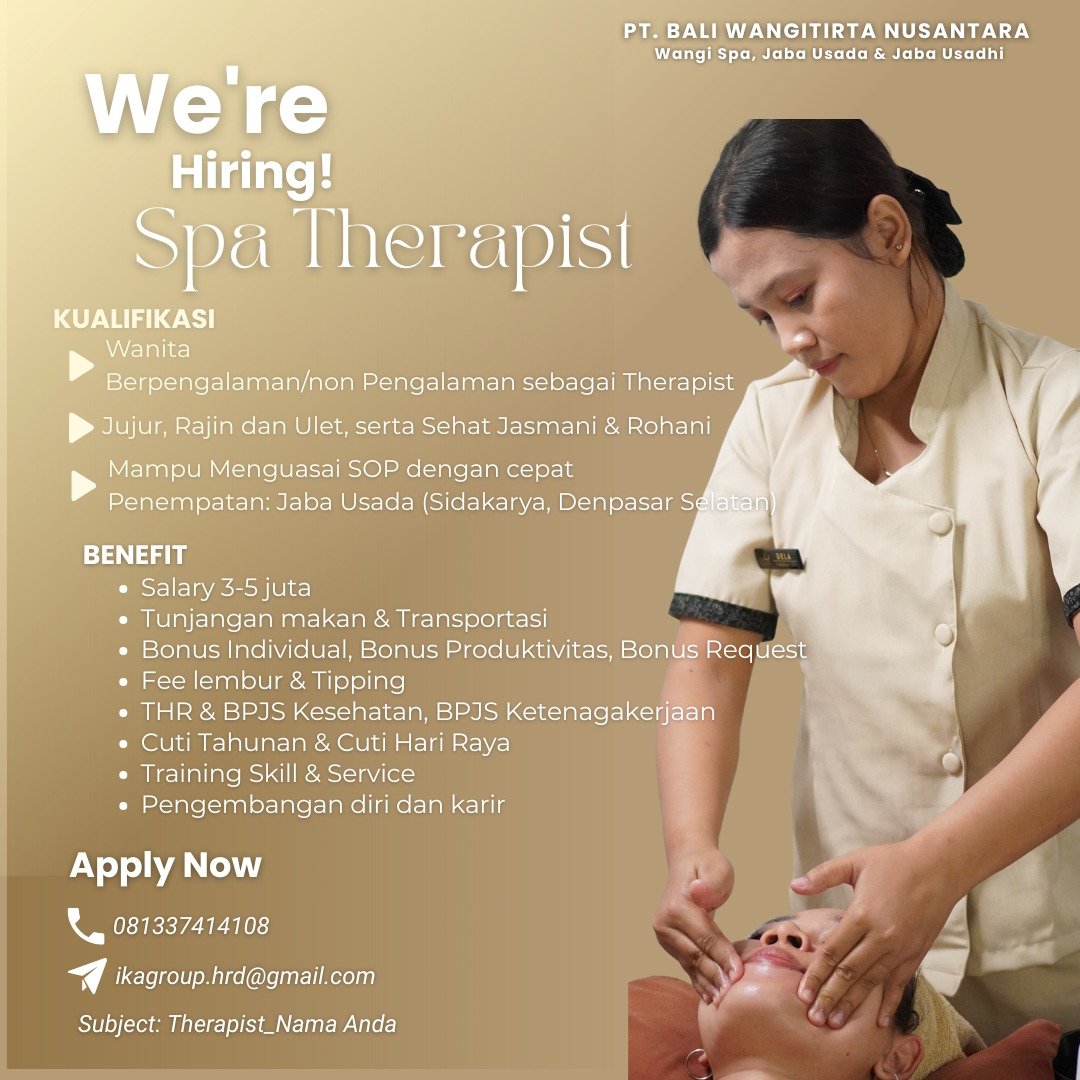 LOKER.BALINEWS.ID, DENPASAR SELATAN – PT Bali Wangitirta Nusantara yang menaungi Wangi Spa, Jaba Usada & Jaba Usadhi membuka lowongan kerja Bali untuk posisi Spa Therapist dengan penempatan di Jaba Usada, Sidakarya, Denpasar Selatan.