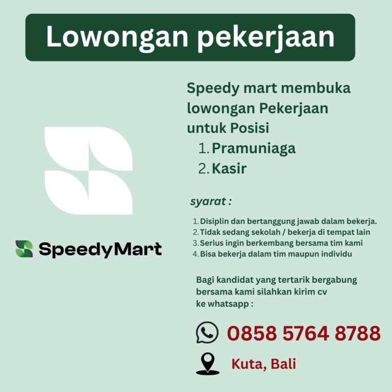 LOKER.BALINEWS.ID, BADUNG – Speedy Mart, jaringan ritel yang sedang berkembang, saat ini sedang membuka kesempatan berkarir bagi tenaga kerja produktif untuk mengisi posisi Pramuniaga dan Kasir. Penempatan kerja difokuskan untuk cabang yang berlokasi di area strategis Kuta, Bali. Perusahaan mencari kandidat yang memiliki disiplin tinggi, rasa tanggung jawab dalam bekerja, serta memiliki keinginan kuat untuk berkembang bersama tim manajemen Speedy Mart.