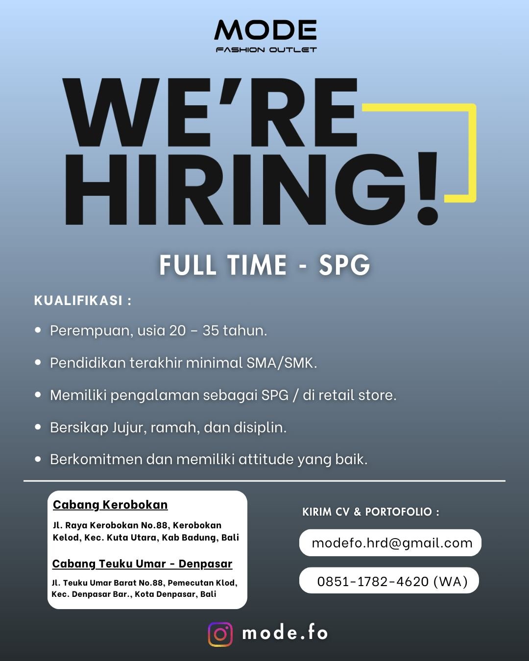 LOKER.BALINEWS.ID, DENPASAR – Mode Fashion Outlet sedang membuka kesempatan kerja bagi talenta muda untuk mengisi posisi SPG (Sales Promotion Girl) Full Time. Lowongan ini tersedia untuk penempatan di dua cabang strategis, yakni Cabang Kerobokan di Kabupaten Badung dan Cabang Teuku Umar di Kota Denpasar. Perusahaan mencari individu yang berkomitmen tinggi dan memiliki sikap kerja yang baik untuk memperkuat layanan retail mereka.