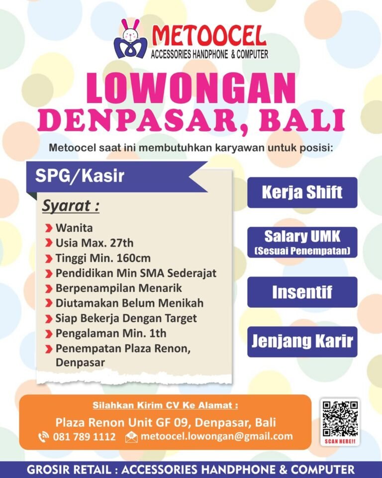 LOKER.BALINEWS.ID, DENPASAR – Peluang karir di bidang ritel aksesori gadget kini terbuka bagi talenta muda di Kota Denpasar. Metoocel, toko grosir dan ritel aksesori handphone serta komputer, sedang mencari karyawan untuk mengisi posisi SPG/Kasir. Posisi ini akan ditempatkan di unit gerai mereka yang berlokasi di Plaza Renon, Denpasar.