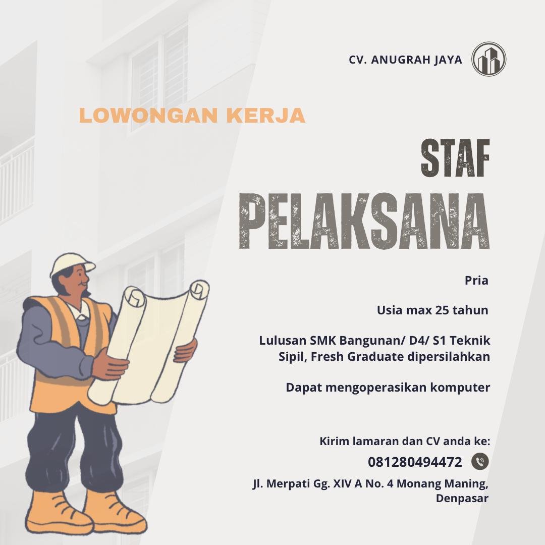 LOKER.BALINEWS.ID, DENPASAR — CV Anugrah Jaya membuka lowongan kerja untuk posisi Staf Pelaksana yang akan ditempatkan di wilayah Monang Maning, Denpasar. Perusahaan konstruksi ini mencari kandidat pria dengan usia maksimal 25 tahun, memiliki latar belakang pendidikan SMK Bangunan, D4, atau S1 Teknik Sipil. Fresh graduate dipersilakan melamar, selama memiliki ketertarikan di bidang proyek lapangan dan siap belajar. Kemampuan mengoperasikan komputer menjadi salah satu kualifikasi penting yang dibutuhkan.
