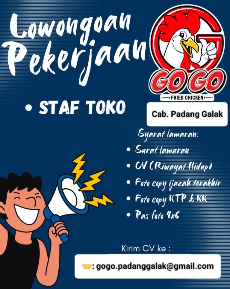 LOKER.BALINEWS.ID, DENPASAR — GoGo Fried Chicken cabang Padang Galak membuka lowongan kerja untuk posisi Staf Toko. Pelamar diminta menyiapkan surat lamaran, CV, fotokopi ijazah terakhir, fotokopi KTP & KK, serta pas foto ukuran 4×6. Kandidat yang memiliki semangat kerja tinggi dan siap mendukung operasional toko sangat diutamakan. Lamaran dikirimkan melalui email sesuai informasi pada pengumuman.