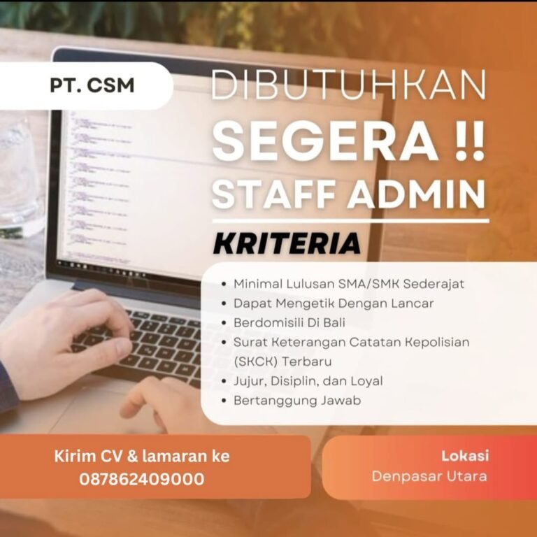 LOKER.BALINEWS.ID, DENPASAR – PT Citra Sarijaya Migas (PT CSM) saat ini sedang membuka kesempatan karir bagi tenaga kerja lokal untuk mengisi posisi Staff Admin. Perusahaan mencari individu yang jujur, disiplin, loyal, dan memiliki rasa tanggung jawab yang tinggi terhadap pekerjaan. Posisi ini diperuntukkan bagi mereka yang berdomisili di Bali dan siap ditempatkan di area operasional Denpasar Utara untuk mendukung kelancaran administrasi perusahaan.