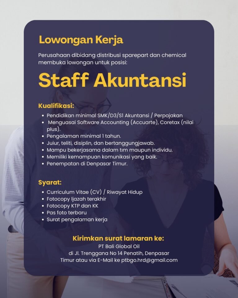 LOKER.BALINEWS.ID, DENPASAR – Sebuah perusahaan yang bergerak di bidang distribusi sparepart dan chemical, PT Bali Global Oil, saat ini tengah membuka kesempatan berkarir bagi tenaga profesional untuk mengisi posisi Staff Akuntansi. Posisi ini diperuntukkan bagi individu yang memiliki latar belakang pendidikan minimal SMK, D3, atau S1 di bidang Akuntansi maupun Perpajakan. Perusahaan mencari kandidat yang jujur, teliti, disiplin, serta bertanggung jawab untuk ditempatkan di wilayah Denpasar Timur.