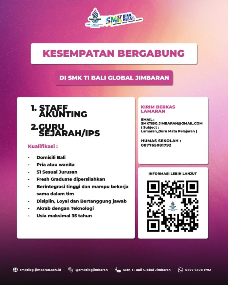 LOKER.BALINEWS.ID, BADUNG – SMK TI Bali Global Jimbaran membuka lowongan kerja Bali untuk posisi Staff Akunting dan Guru Sejarah/IPS. Kesempatan ini terbuka bagi pria maupun wanita yang berdomisili di Bali, berpendidikan minimal S1 sesuai jurusan, serta fresh graduate dipersilakan melamar.