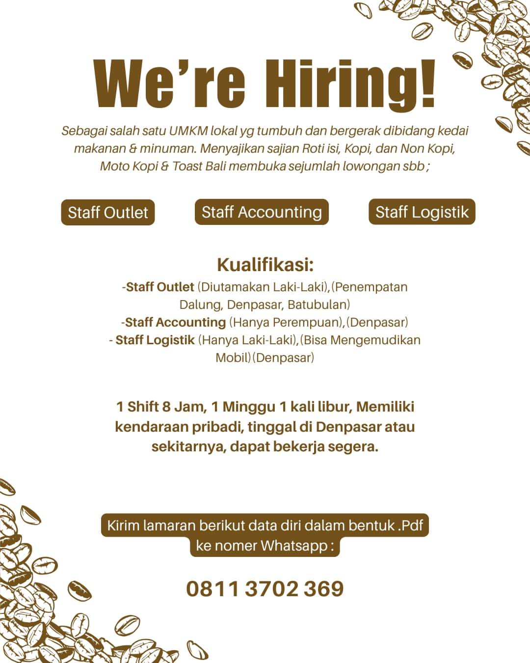 LOKER.BALINEWS.ID, DENPASAR — Kesempatan kerja terbaru di Bali kembali dibuka melalui Lowongan Kerja Bali Staff Outlet, Staff Accounting, dan Staff Logistik. Sebagai salah satu UMKM lokal yang terus berkembang di bidang kedai makanan dan minuman, Moto Kopi & Toast Bali membuka peluang bagi pencari kerja yang ingin bergabung dan berkembang bersama tim. Posisi yang tersedia meliputi Staff Outlet dengan penempatan Dalung, Denpasar, dan Batubulan, Staff Accounting khusus penempatan Denpasar, serta Staff Logistik yang juga ditempatkan di wilayah Denpasar.