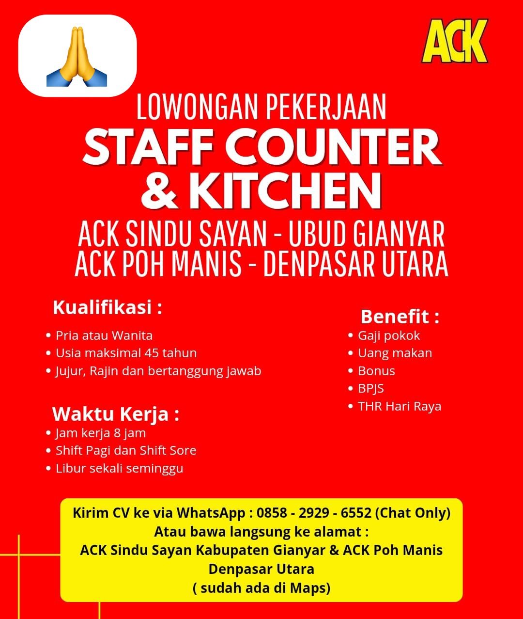 LOKER.BALINEWS.ID, BALI – ACK membuka kesempatan kerja untuk posisi Staff Counter & Kitchen yang akan ditempatkan di dua lokasi, yakni ACK Sindu Sayan – Ubud, Gianyar, serta ACK Poh Manis – Denpasar Utara. Perusahaan mencari kandidat pria maupun wanita, dengan usia maksimal 45 tahun, serta memiliki sikap jujur, rajin, dan bertanggung jawab.
