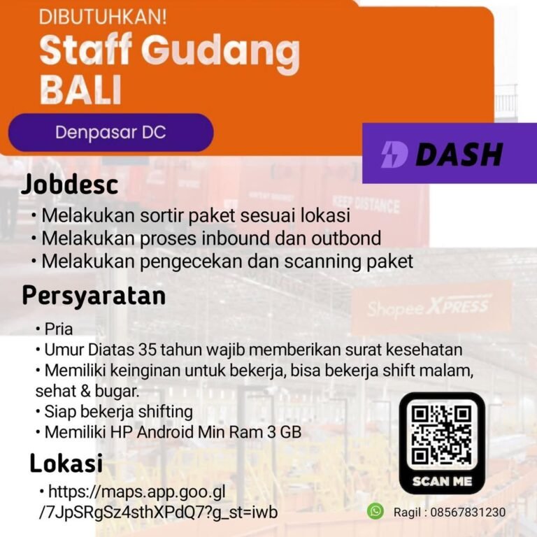 LOKER.BALINEWS.ID, DENPASAR – Perusahaan logistik DASH saat ini membuka lowongan kerja Bali untuk posisi Staff Gudang dengan penempatan di Denpasar DC. Kesempatan ini terbuka bagi kandidat pria yang siap bekerja dalam sistem shifting, termasuk shift malam, serta memiliki kondisi fisik yang sehat dan bugar.
