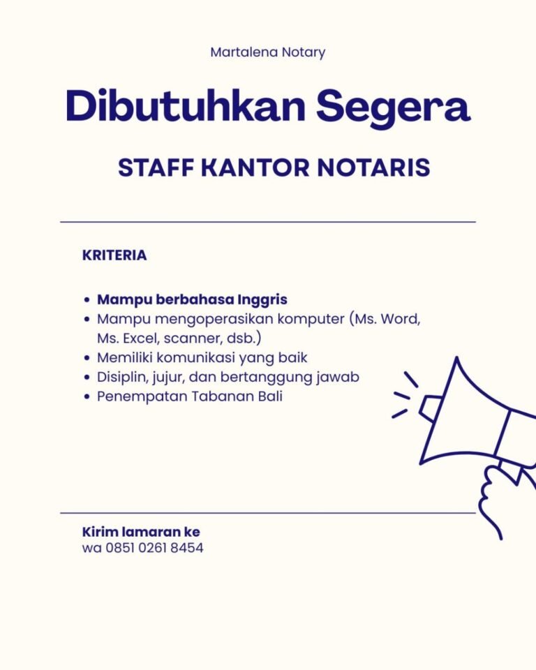 LOKER.BALINEWS.ID, TABANAN — Dibuka kesempatan bergabung sebagai Staff Kantor Notaris untuk Anda yang teliti, komunikatif, dan bertanggung jawab. Posisi ini membutuhkan kandidat yang mampu mengoperasikan komputer (Ms. Word, Ms. Excel, scanner, dan aplikasi pendukung lainnya), memiliki kemampuan berkomunikasi yang baik, serta mampu berbahasa Inggris. Disiplin, jujur, dan siap memegang tanggung jawab menjadi nilai tambahan bagi pelamar.