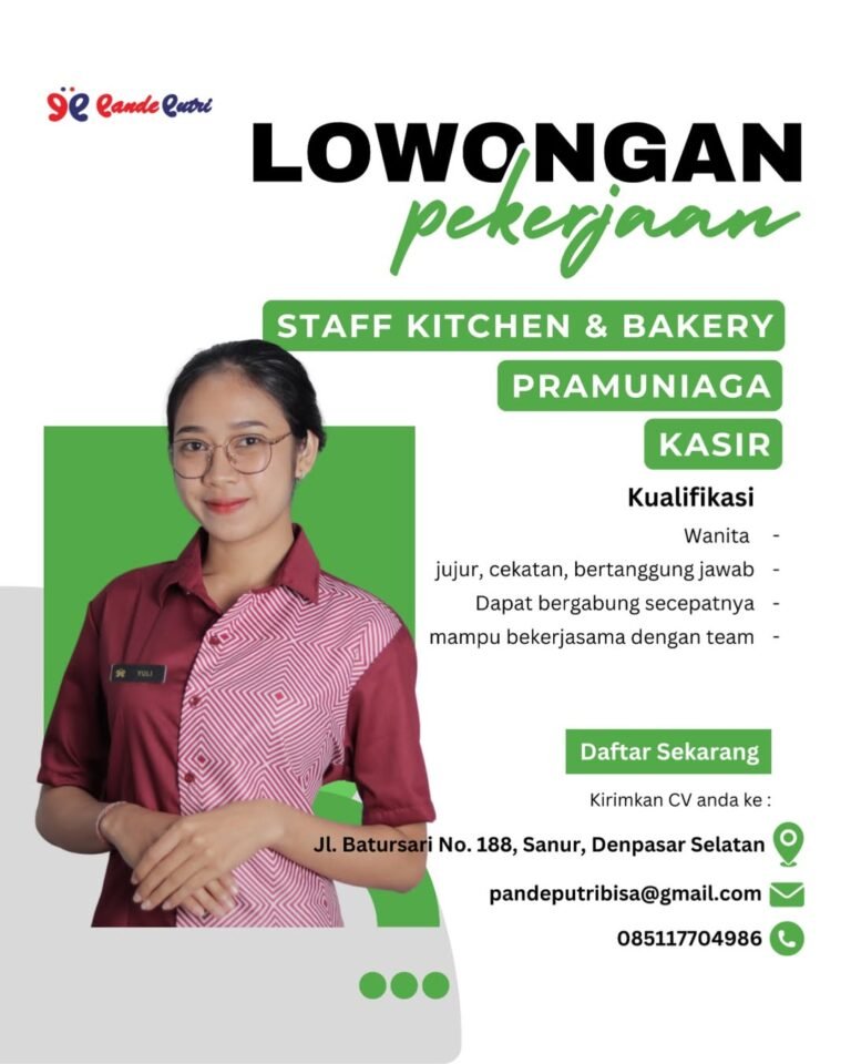 LOKER.BALINEWS.ID, DENPASAR – Toko Pande Putri, yang berlokasi di kawasan strategis Sanur, saat ini sedang membuka kesempatan kerja bagi tenaga kerja lokal untuk mengisi tiga posisi sekaligus, yaitu Staff Kitchen & Bakery, Pramuniaga, dan Kasir. Kesempatan ini terbuka bagi kandidat wanita yang memiliki semangat kerja tinggi dan berkomitmen untuk memberikan pelayanan terbaik bagi pelanggan di wilayah Denpasar Selatan.
