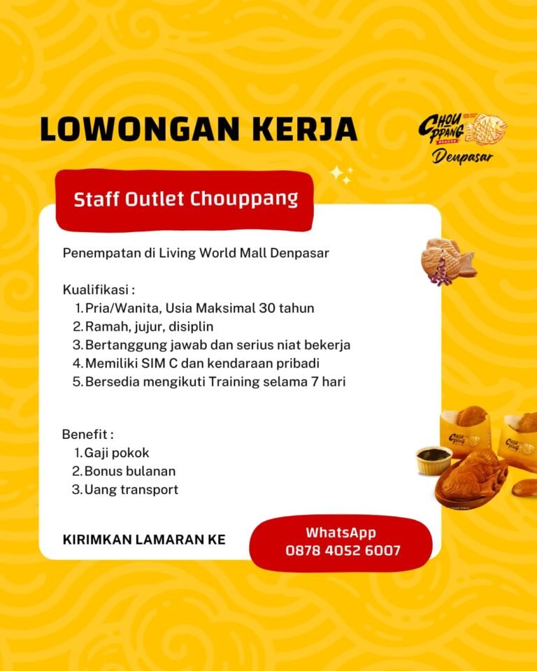 Bagi Anda yang berminat melamar lowongan kerja Bali posisi Staff Outlet di Chouppang, silakan mengirimkan lamaran melalui WhatsApp 0878 4052 6007.