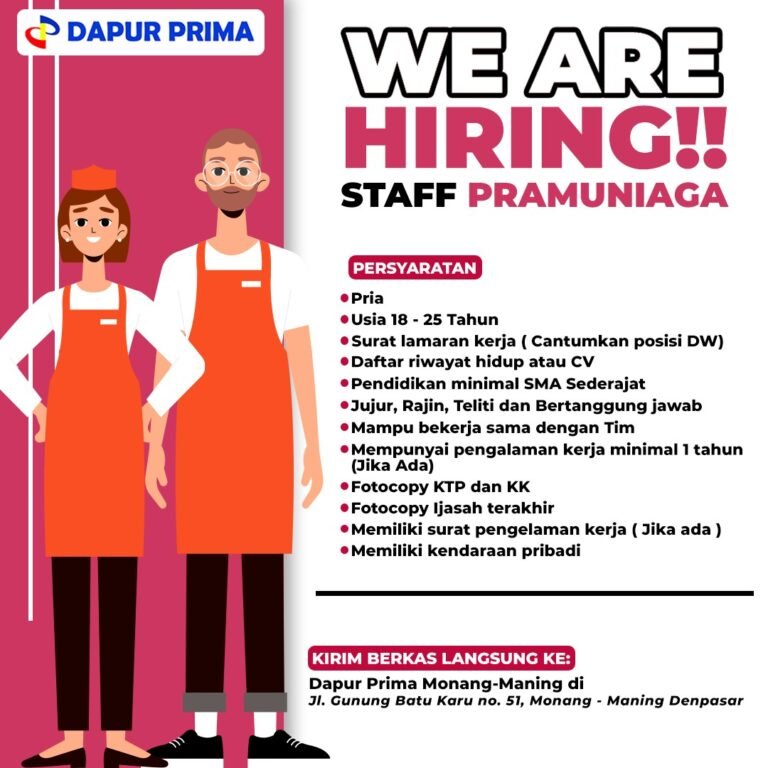 LOKER.BALINEWS.ID, DENPASAR – Dapur Prima, jaringan toko perlengkapan rumah tangga terkemuka di Bali, saat ini sedang membuka kesempatan berkarir bagi para pencari kerja untuk mengisi posisi sebagai Staff Pramuniaga di cabang Monang-Maning, Denpasar. Lowongan ini terbuka khusus bagi pria dengan rentang usia antara 18 hingga 25 tahun yang memiliki latar belakang pendidikan minimal SMA Sederajat. Perusahaan mencari individu yang jujur, rajin, teliti, serta memiliki rasa tanggung jawab yang tinggi dalam menjalankan tugasnya. Selain itu, calon pelamar diharapkan mampu bekerja sama dalam tim dan diutamakan memiliki kendaraan pribadi untuk mendukung mobilitas kerja.