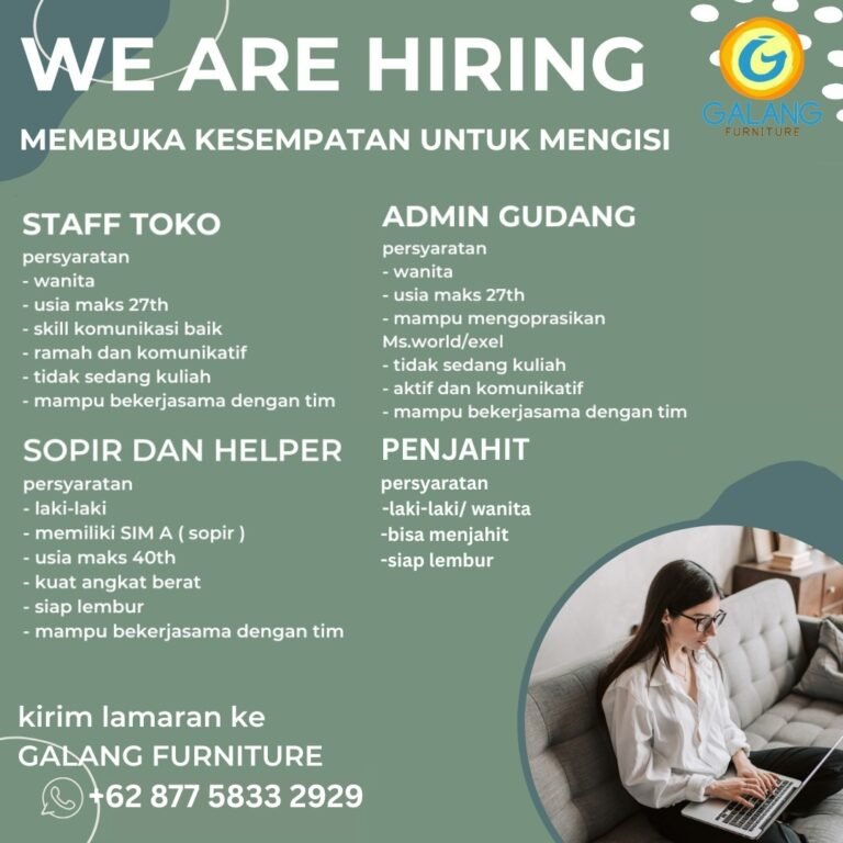 Galang Furniture menawarkan lingkungan kerja yang suportif dan kesempatan berkembang bagi karyawan. Bagi pelamar yang berminat, dapat segera mengirimkan lamaran melalui WhatsApp sesuai kontak yang tertera untuk proses seleksi lebih lanjut.