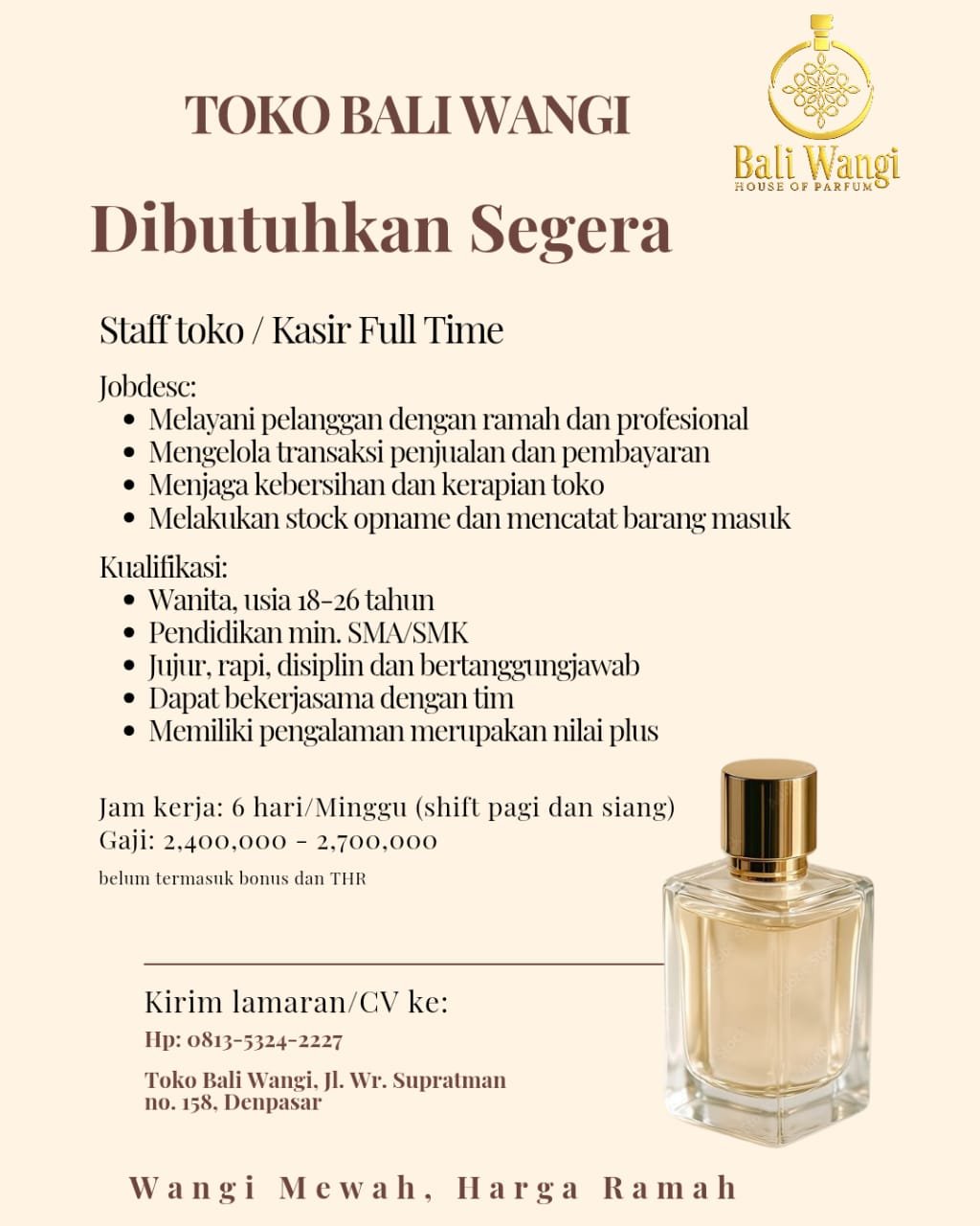 LOKER.BALINEWS.ID, DENPASAR – Toko Bali Wangi membuka lowongan kerja Bali terbaru untuk posisi Staff Toko / Kasir Full Time. Posisi ini bertanggung jawab dalam melayani pelanggan secara ramah dan profesional, mengelola transaksi penjualan dan pembayaran, menjaga kebersihan serta kerapian toko, hingga melakukan stock opname dan pencatatan barang masuk.